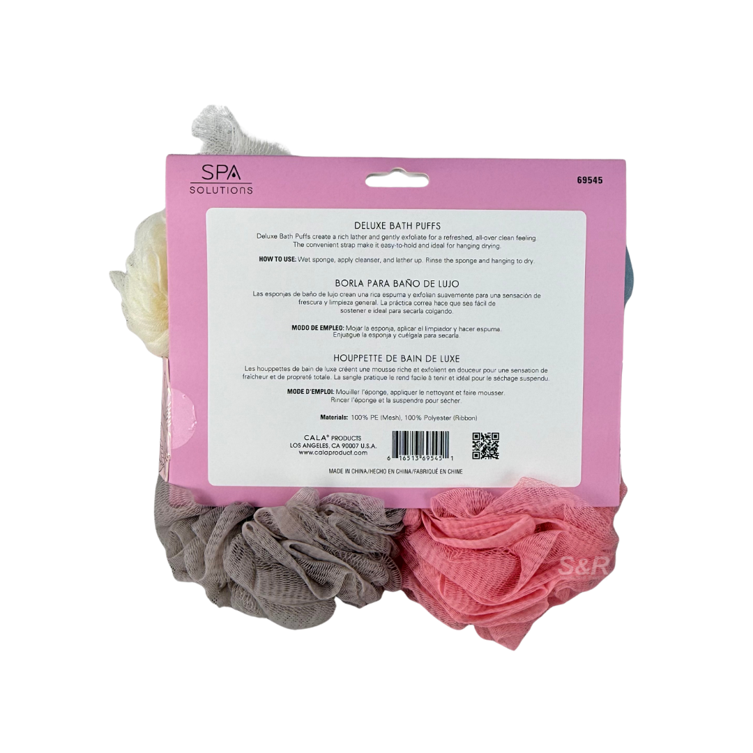 • Spa Solutions Deluxe Bath Puffs offer a luxurious cleansing experience. Made with durable mesh material, each puff gently exfoliates dead skin while producing rich foam for an invigorating bath. These puffs come in an assortment of pastel colors and are easy to hang and dry. Enjoy a refreshing and effective cleanse every time you shower.