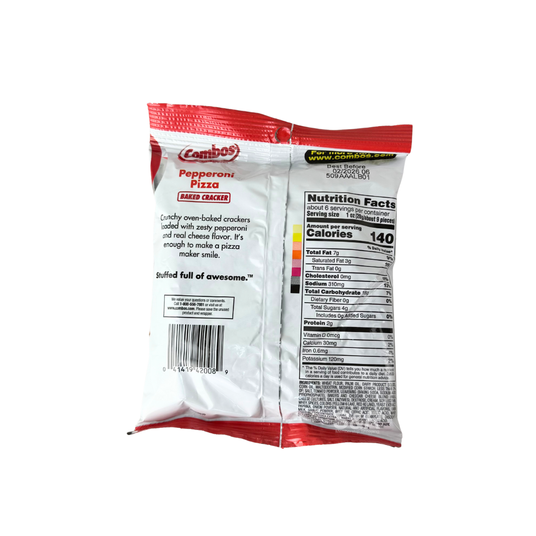 • Combos Pepperoni Pizza Baked Crackers bring the taste of pizza in a crunchy, bite-sized snack. With a crispy cracker shell stuffed with cheesy, pepperoni-flavored filling, they’re perfect for satisfying cravings anytime. Their convenient packaging makes them great for lunch boxes, road trips, or snacking at home. Bold in flavor and fun to eat, Combos delivers a deliciously unique snack experience.