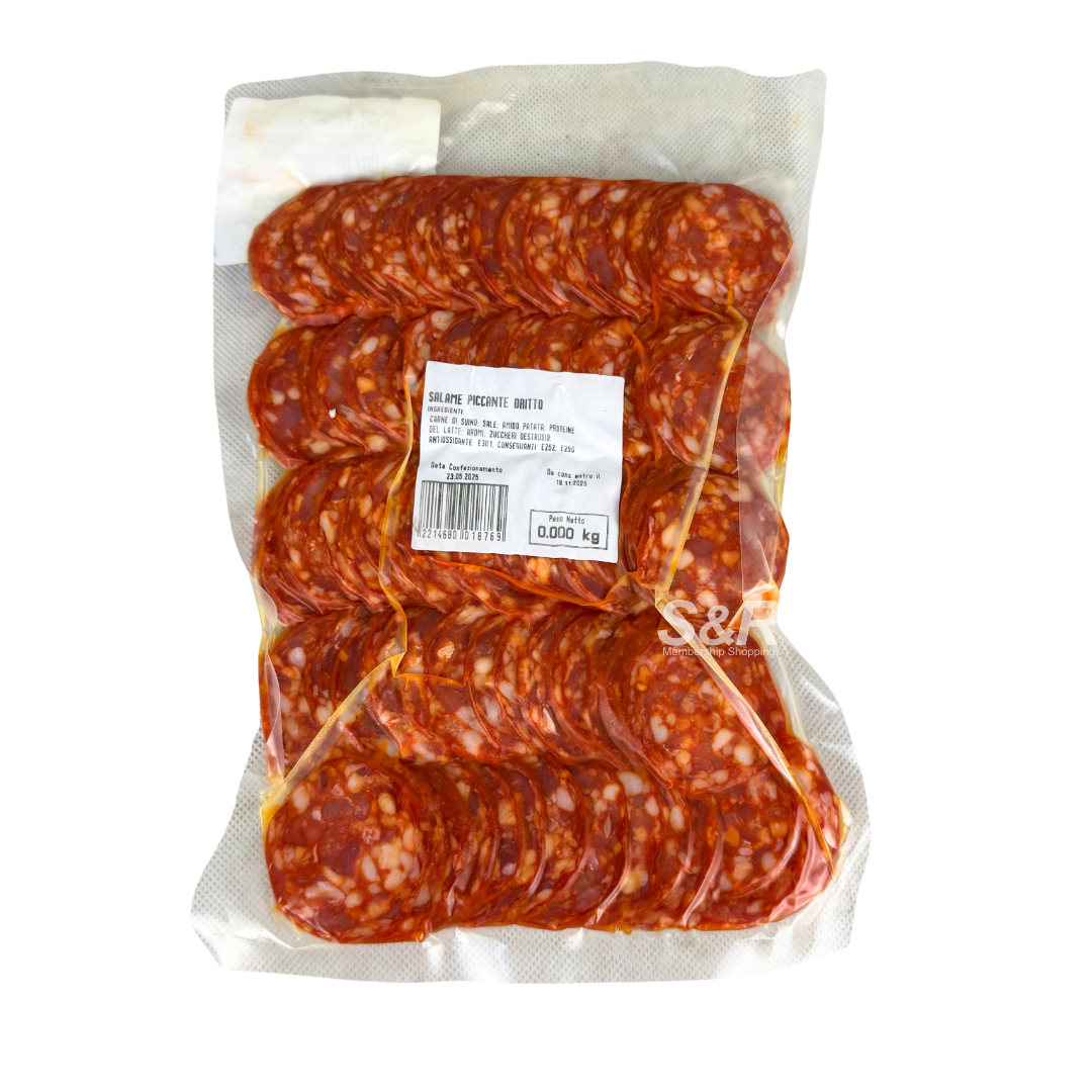 S&R Piccante Dritto is for those who love a little heat in their cured meats. This spicy Italian salami is made from premium pork and seasoned with chili for a bold kick. Perfect for adding zest to sandwiches, pizzas, and antipasto platters, it delivers robust flavor in every bite.