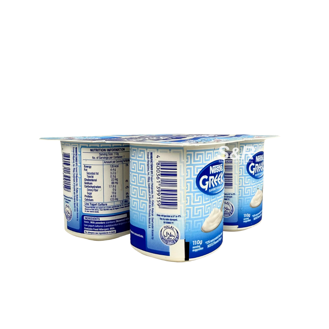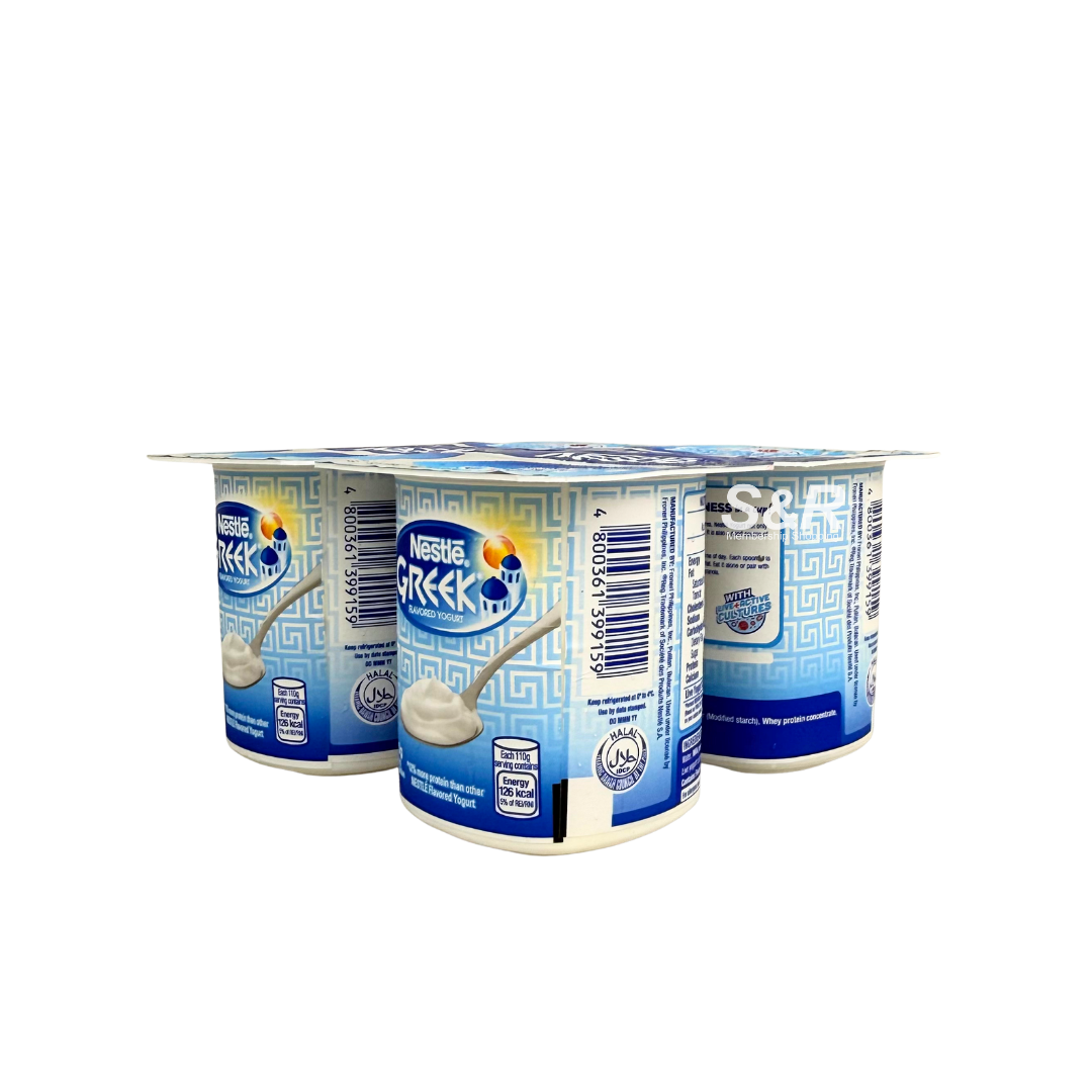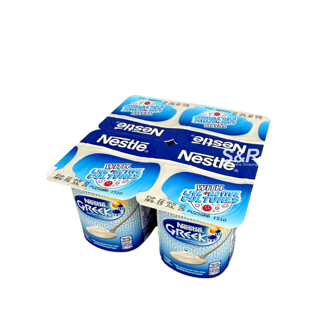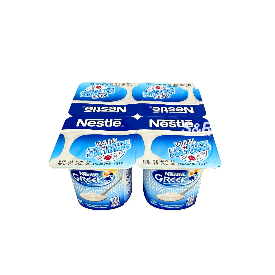 Nestle Greek Flavored Yogurt comes in a convenient pack of four, offering a creamy Greek-style texture and a variety of flavors. It’s perfect for on-the-go snacking or breakfast.