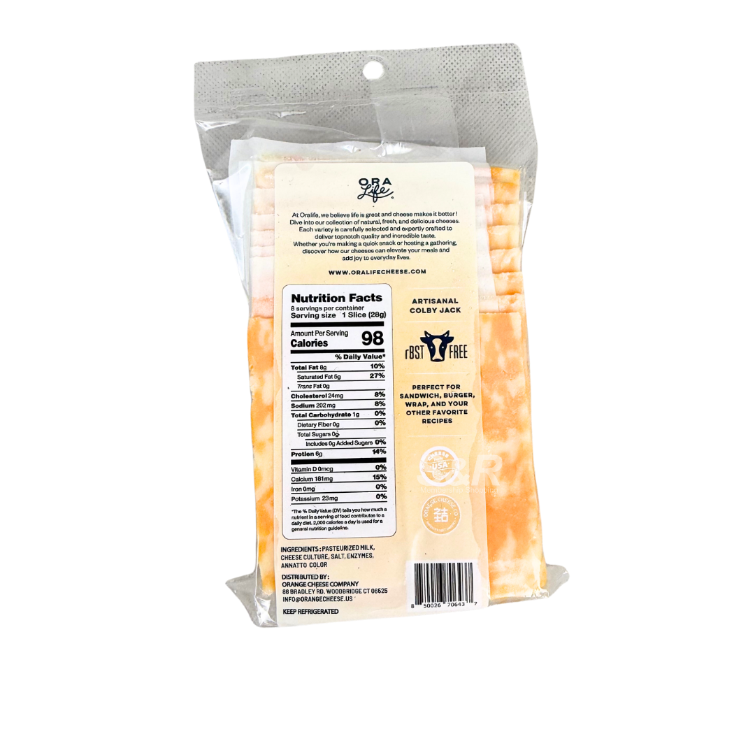Oralife Colby Jack Cheese Slices combine the mild, creamy taste of Monterey Jack with the buttery richness of Colby. The marbled look adds visual appeal to sandwiches and platters. Convenient slices make them ideal for quick meal prep.