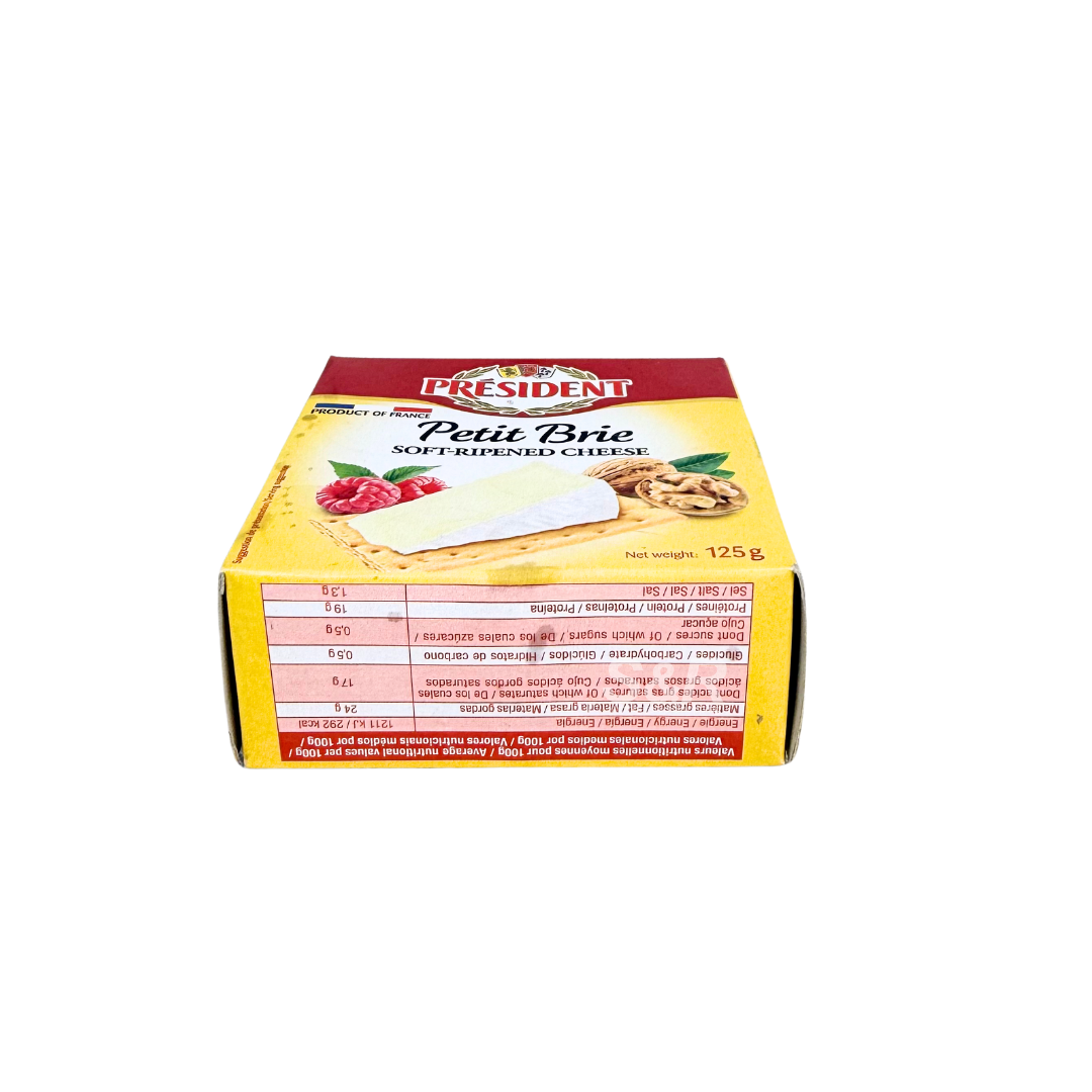 President Petit Brie Cheese 125g is a French soft cheese with a creamy interior and delicate flavor. It’s ideal for serving as part of a cheese board or baking into appetizers. Its small size makes it perfect for intimate gatherings or personal enjoyment.