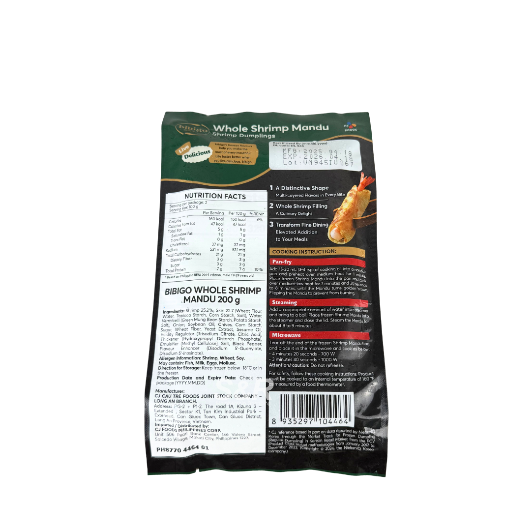 • Bibigo Whole Shrimp Mandu Shrimp Dumplings are a seafood lover’s delight, featuring whole, succulent shrimp encased in a delicate wrapper. Inspired by authentic Korean flavors, they can be steamed or pan-fried for a satisfying appetizer or meal. With no added MSG and quick preparation time, they’re perfect for enjoying a restaurant-quality dish at home.