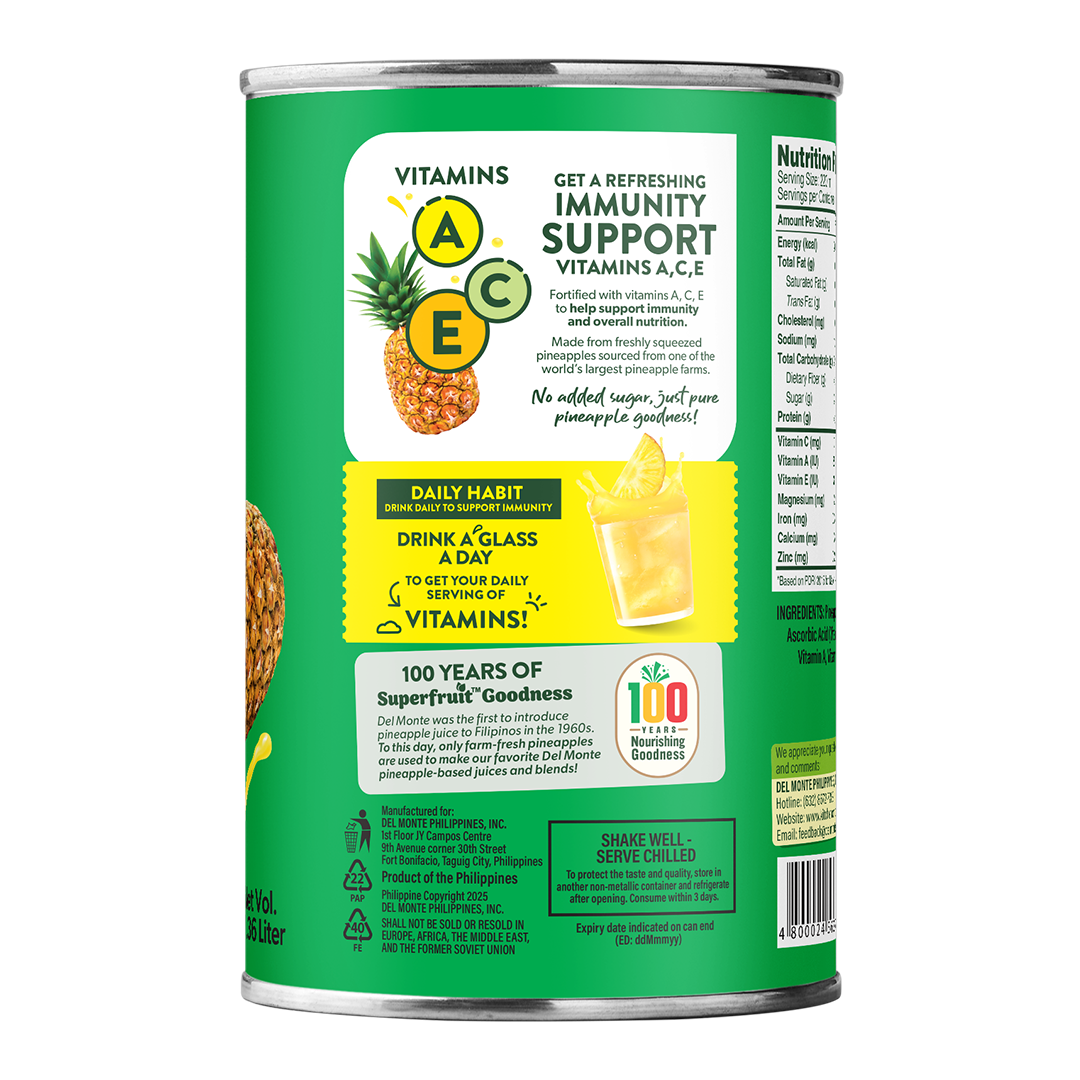 • Want a healthier fruity drink? Surprise, Surprise!!! Here's Del Monte Pineapple Juice. A juice powered with Vitamins A, C, and E that supports our immune system, and with antioxidants that help build body resistance, you could enjoy a relaxing drink without thinking if it's healthy or not.