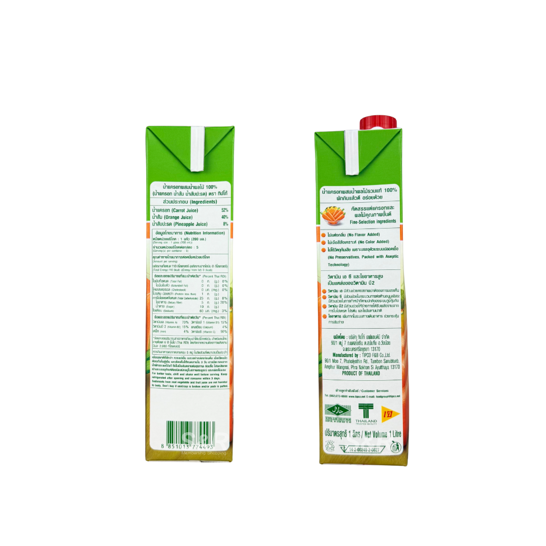 Tipco 100% Carrot Juice provides a healthy, naturally sweet beverage packed with vitamins and nutrients. Made without preservatives, it delivers pure carrot goodness with every sip. Its refreshing taste makes it enjoyable on its own or as part of smoothies and juice blends. The 1L carton ensures enough for daily family use.