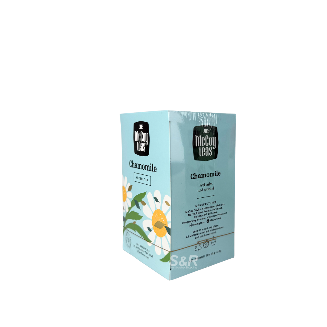 McCoy Teas Chamomile Herbal Tea delivers a soothing and relaxing infusion that helps calm the mind and body. Naturally caffeine-free, it’s the perfect drink before bedtime. With a mild floral flavor, this tea provides a comforting experience in every sip.