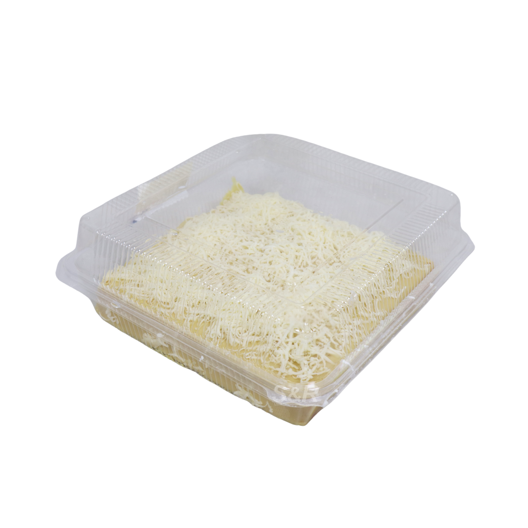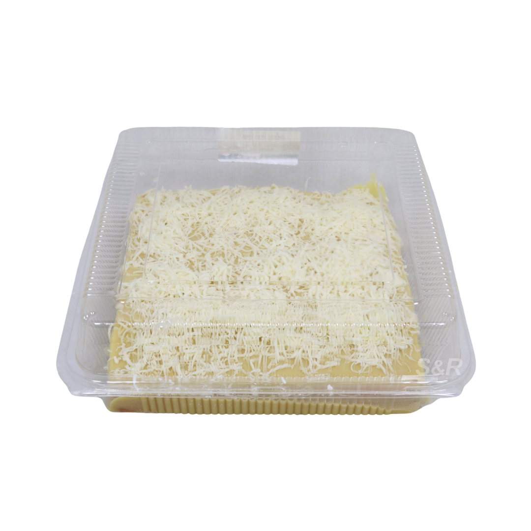 S&R Cheesy Yema Cake features layers of soft sponge cake topped with rich yema buttercream and shredded cheese. The combination of sweet and savory flavors creates a uniquely indulgent dessert for special occasions or personal treats.