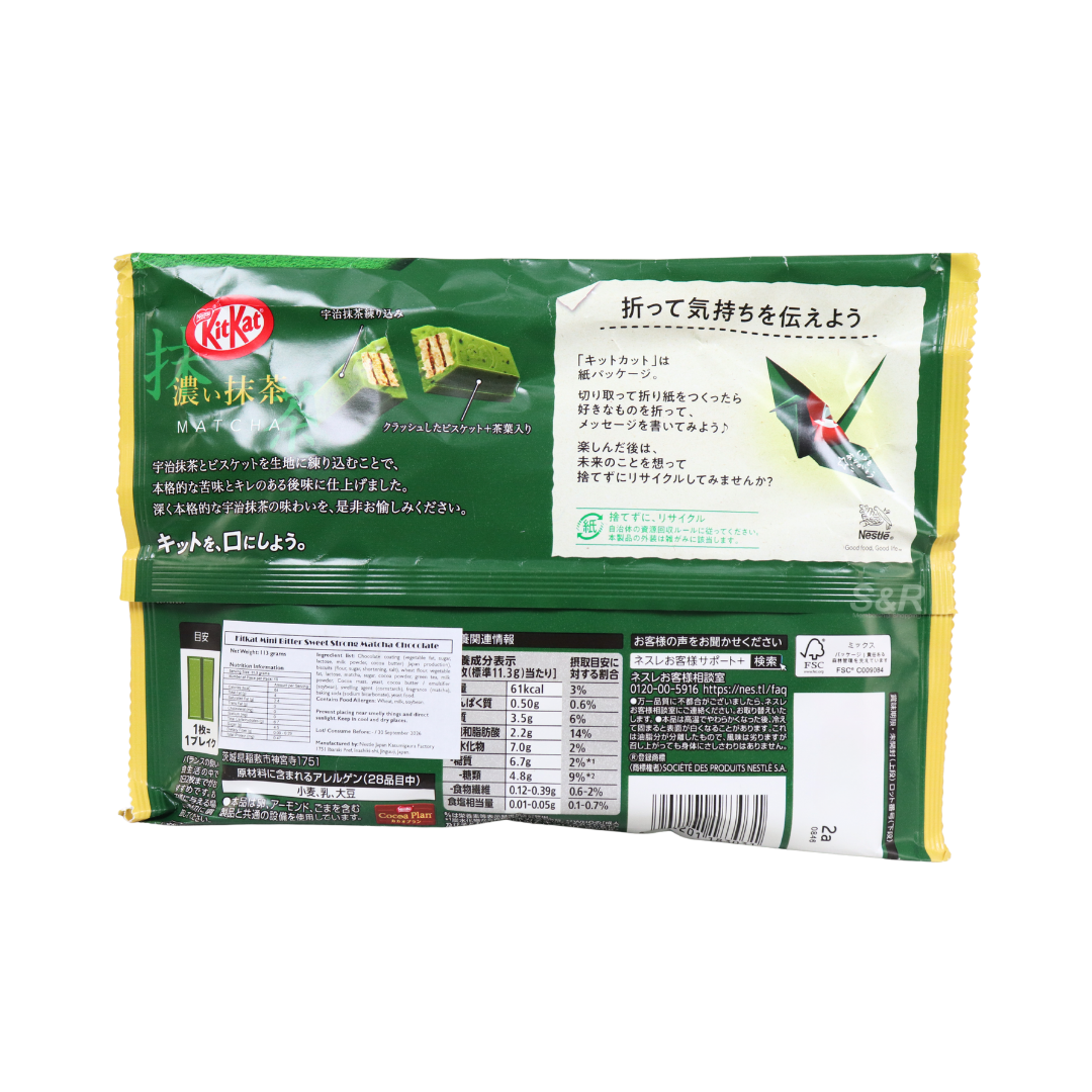KitKat Green Tea Chocolate offers a unique flavor twist by pairing crisp wafer layers with smooth green tea flavored chocolate. The subtle tea notes provide a refined taste balanced by light sweetness. Individually portioned pieces make it easy to share or enjoy in moderation. Ideal for snacks or gifting, this variant delivers the signature KitKat crunch with a distinctive flavor profile.