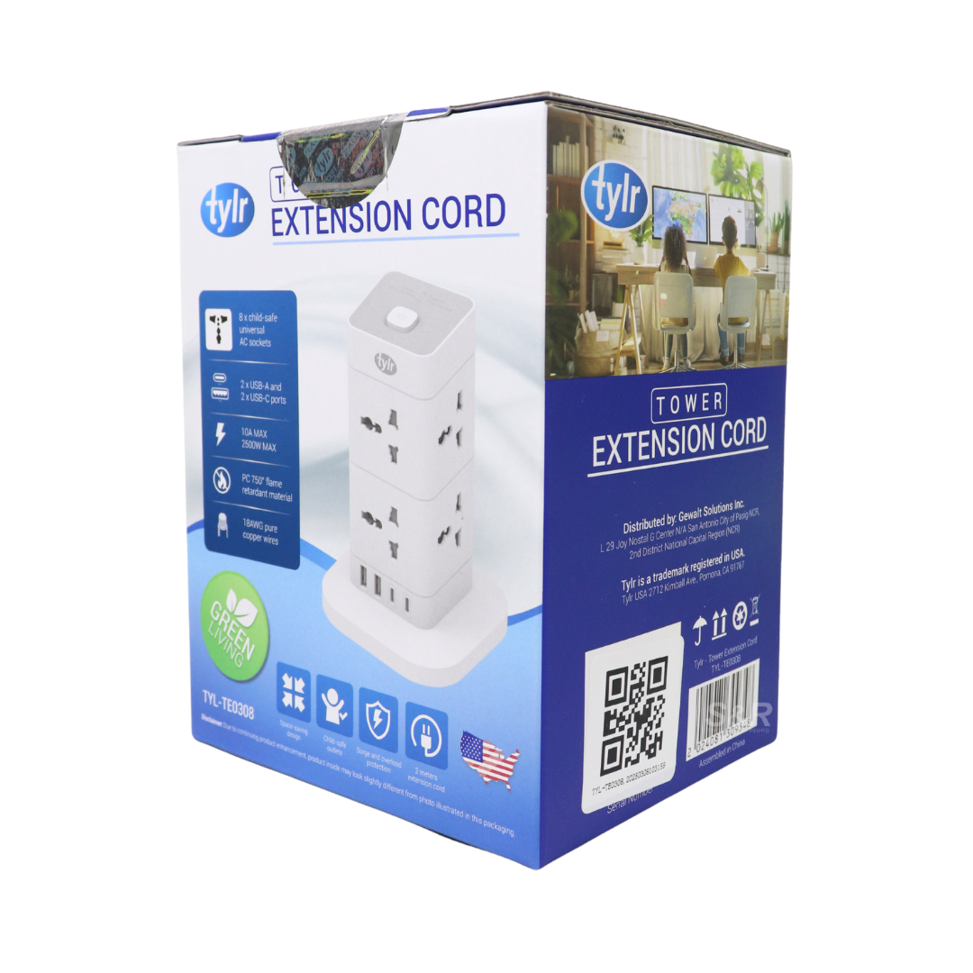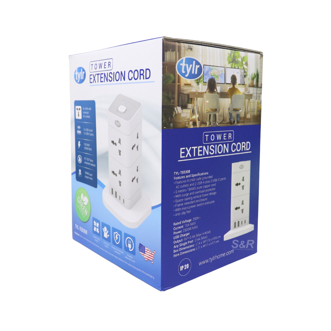 Tylr Tower Extension Cord TYL-TE0308 offers a reliable solution for extending power access with multiple outlets. Its durable design ensures long-lasting performance, making it suitable for home, office, and outdoor use. This extension cord provides convenience and flexibility, allowing you to power multiple devices simultaneously while maintaining safety and efficiency.