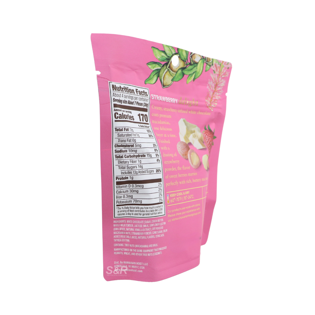• Premium macadamia nuts coated in strawberries and cream flavored white chocolate. A smooth, indulgent confection perfect for gifting or personal enjoyment.