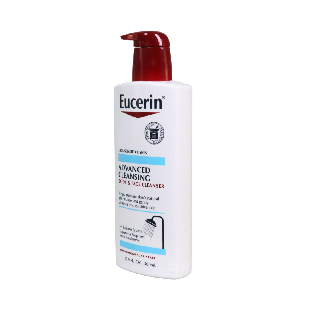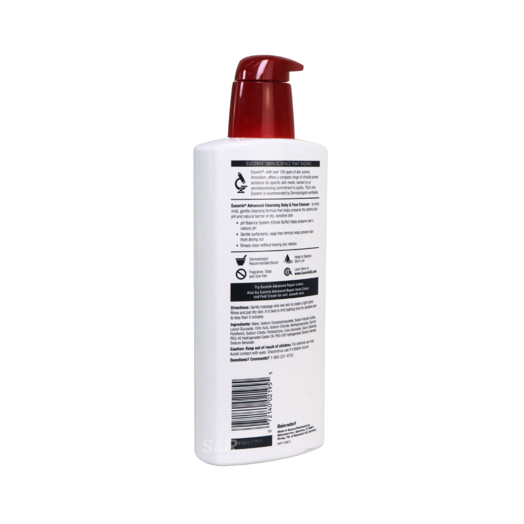 • Eucerin Advanced Cleansing Body & Face Cleanser is formulated to provide thorough yet gentle cleansing for sensitive and dry skin types. Its soap-free, fragrance-free formula effectively removes dirt, oil, and impurities without stripping the skin of essential moisture. Designed for use on both the face and body, it helps support the skin’s natural protective barrier while leaving skin feeling soft and comfortable after every wash. Suitable for daily use, this cleanser fits seamlessly into regular skincare routines for consistent, reliable care.
