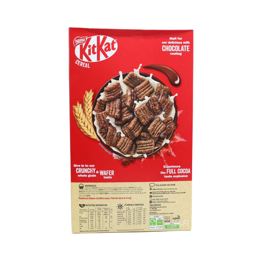 • Kitkat Chocolate Cereal blends the crispiness of cereal with the delicious richness of chocolate, making it perfect for breakfast or a quick snack. Crafted with quality ingredients, this cereal offers a delightful taste experience that’s both satisfying and convenient. The resealable packaging ensures freshness, making it easy to enjoy anytime.