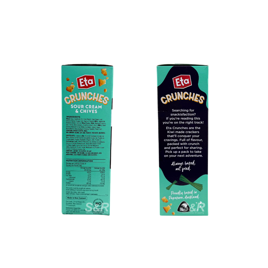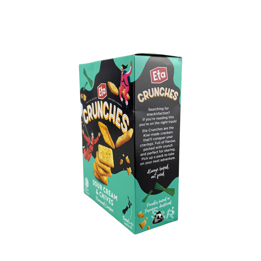 • Eta Crunches Sour Cream & Chives Crackers combine tangy and savory notes in a crunchy snack. Their delicious flavor profile makes them a versatile option for any occasion, whether paired with dips or eaten straight from the pack. Lightweight and convenient, they’re great for quick snacks at work, home, or during travel. With Eta’s dedication to taste and quality, these crackers deliver consistent satisfaction.