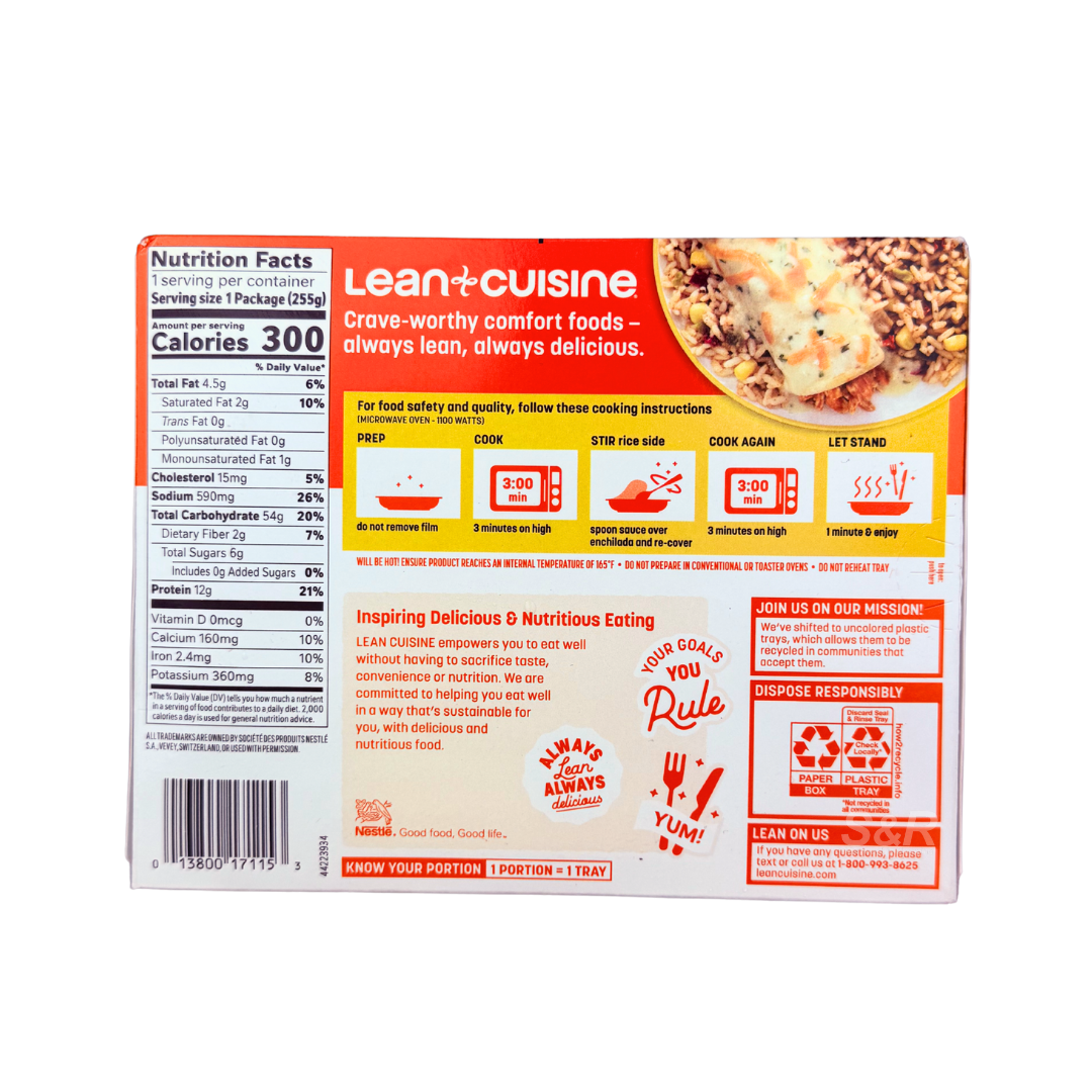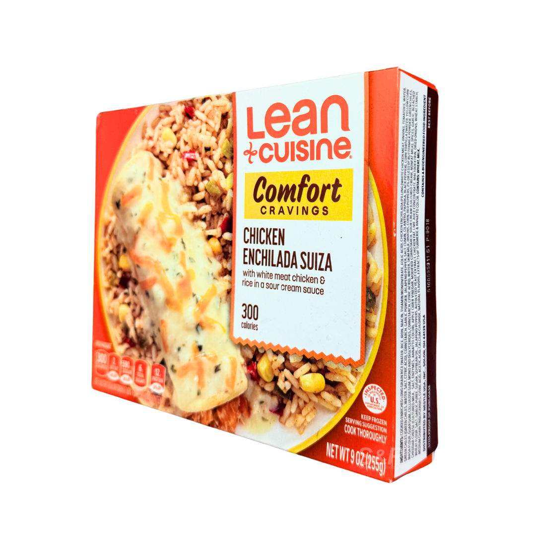 • Lean Cuisine Chicken Enchilada Suiza combines authentic Mexican flavor with smart nutrition. Each serving features tender white meat chicken wrapped in a corn tortilla, topped with creamy Suiza sauce, and paired with a side of seasoned rice. It’s a delicious, portion-controlled meal that fits perfectly into a balanced diet. Quick to prepare and full of comforting flavors, it’s the ideal choice for busy days when you want wholesome, convenient dining.