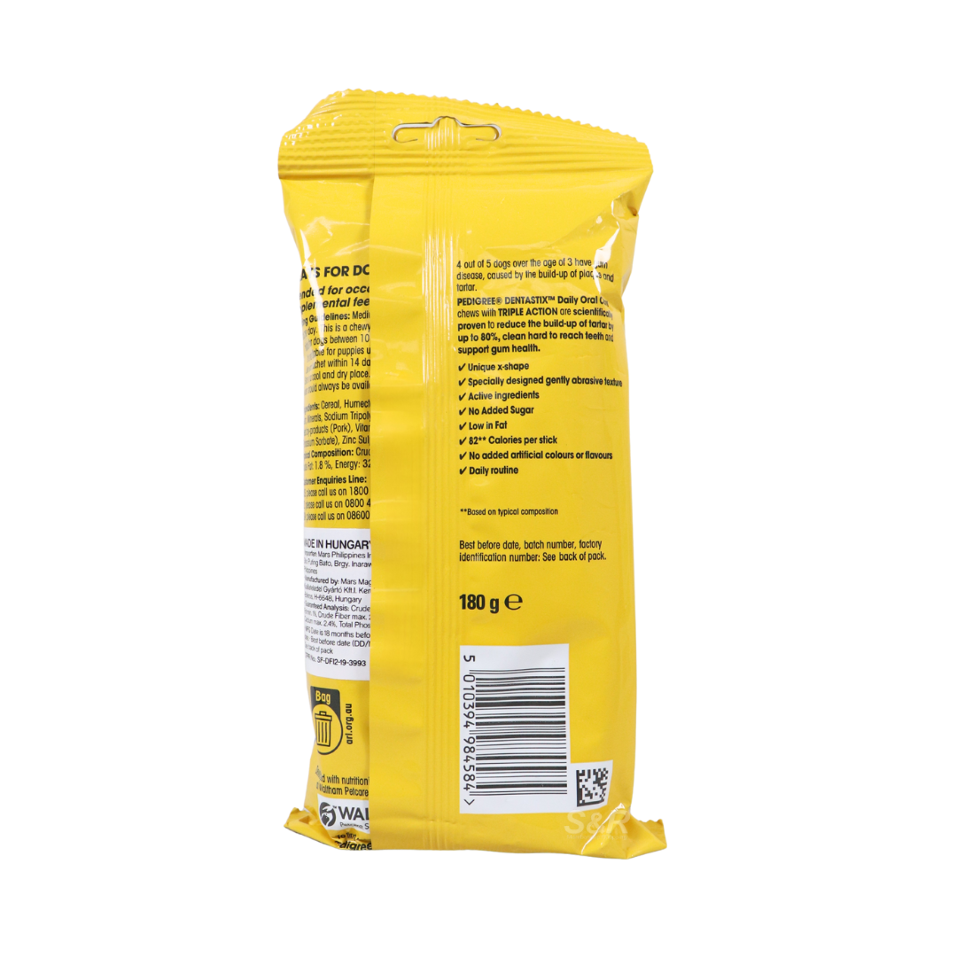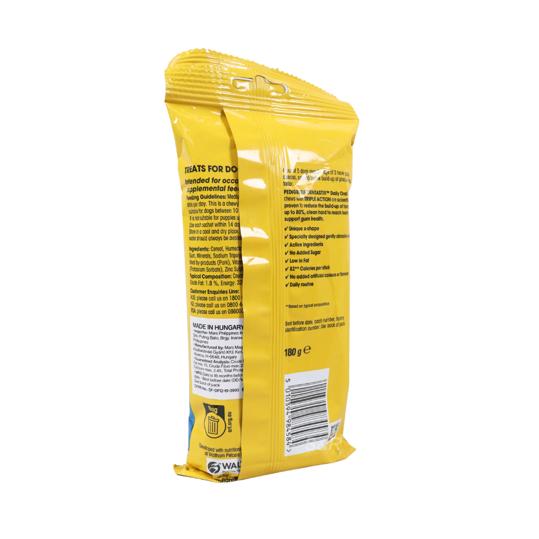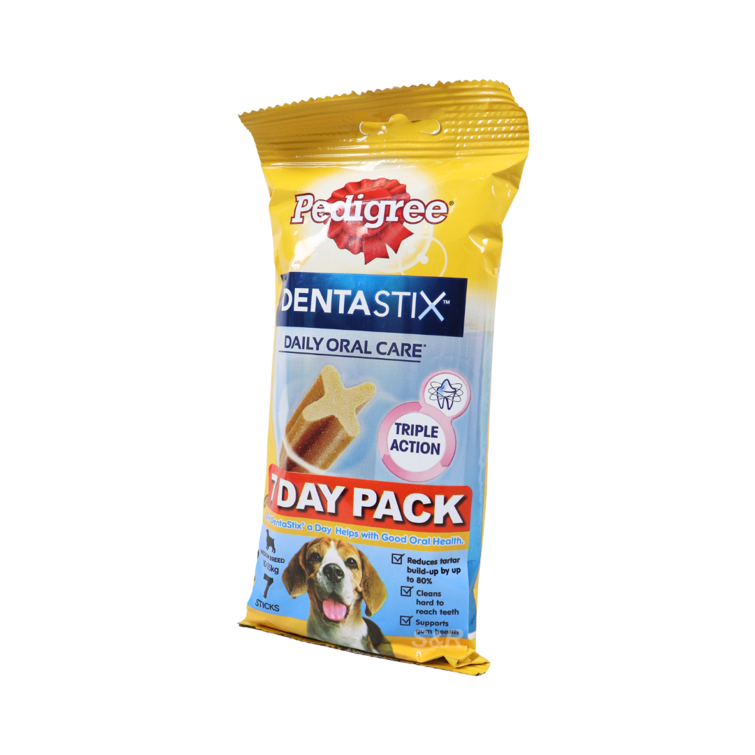 Pedigree Dentastix 7-Day Pack is formulated to support dental health in medium breed dogs. Each treat helps reduce tartar and plaque buildup, promoting fresher breath and healthier gums. The 7-day pack ensures a daily dental care routine, making it easy to maintain your dog’s oral hygiene. Ideal for medium breed dogs, these treats offer a tasty and effective way to care for your pet’s teeth.