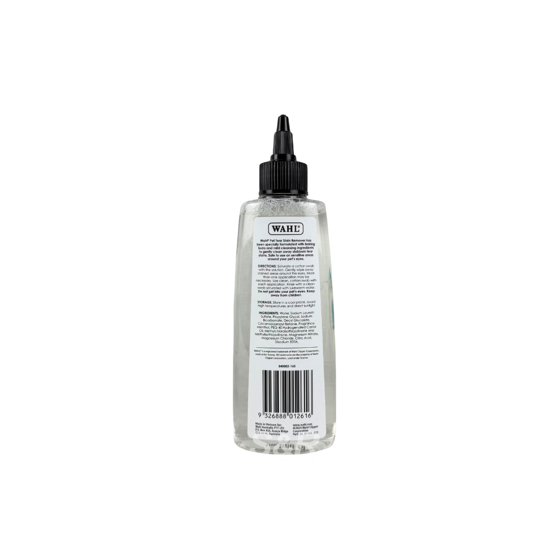 • The Wahl Pet Tear Stain Remover has been specially formulated with baking soda and mild cleansing compounds to gently clean away stubborn tear stains. Mild enough to use in sensitive areas.Helps to clean away stubborn tear stainsBaking soda and mild cleansersGreat for sensitive areas175 mL