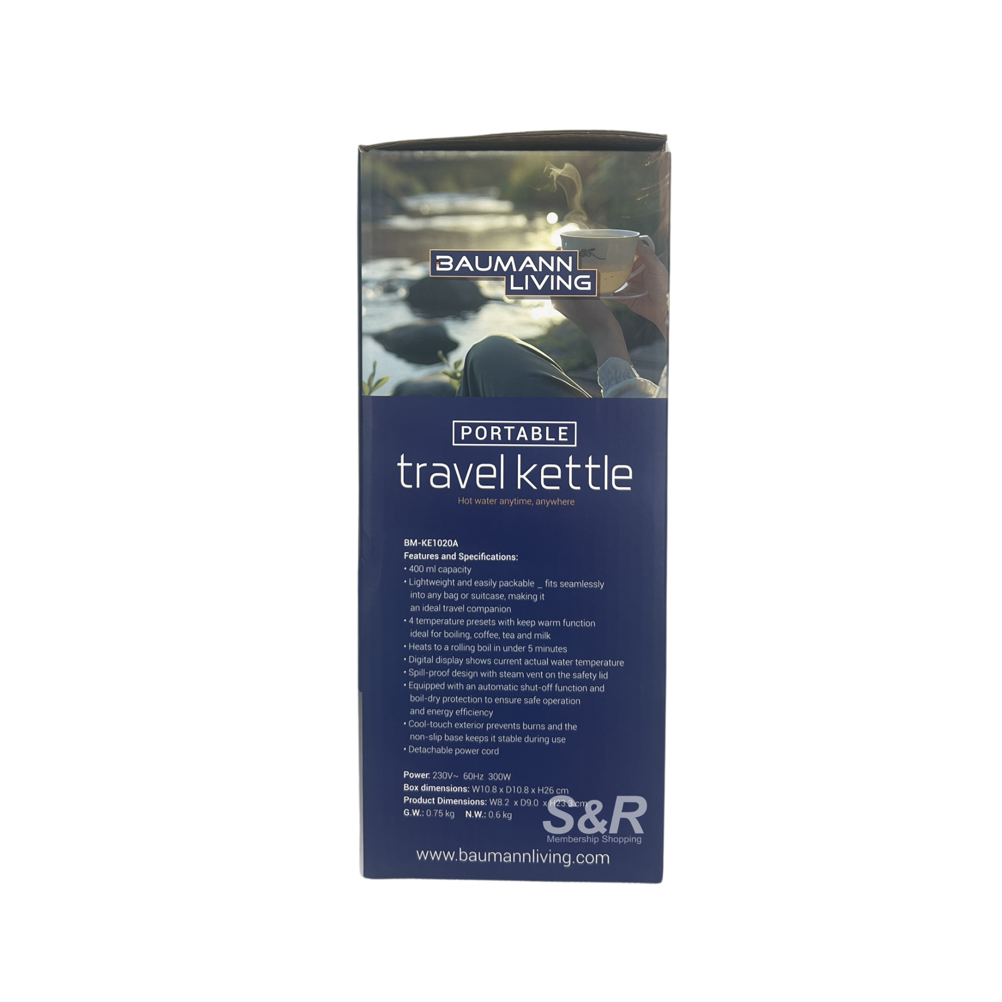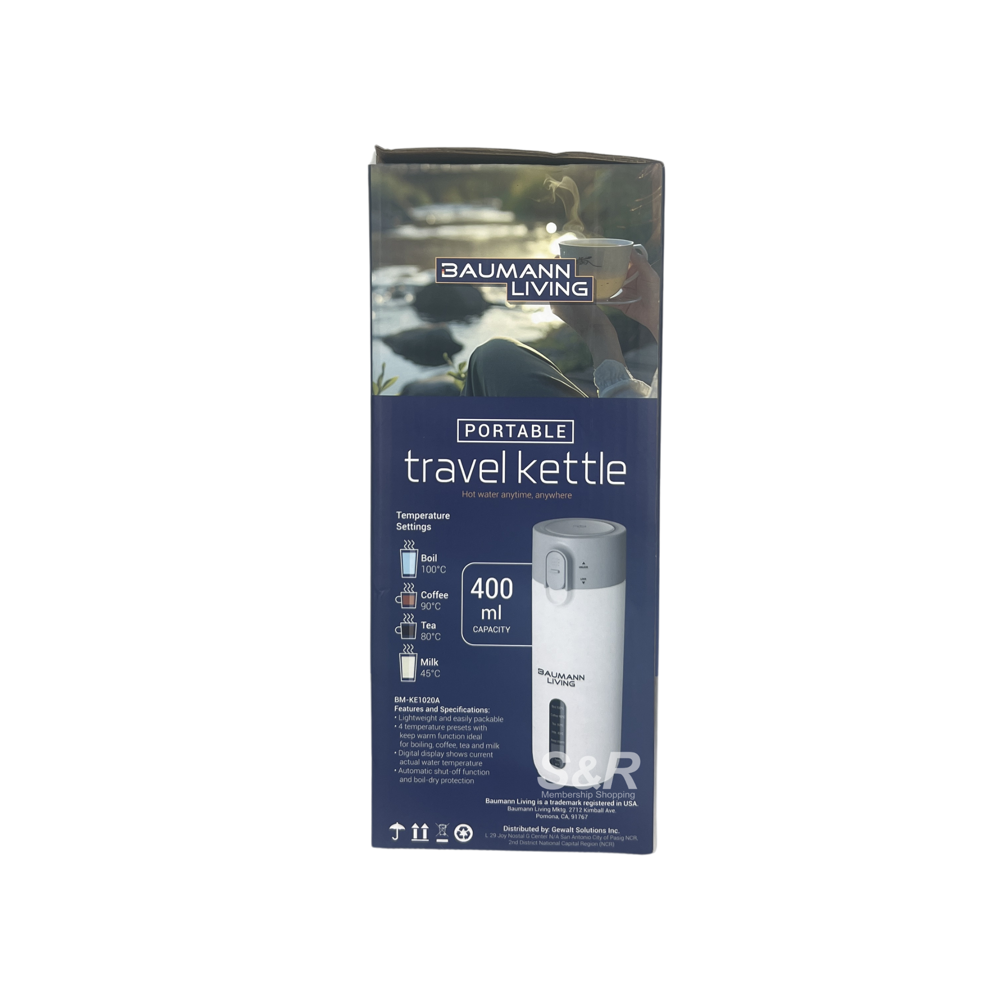 • The Baumann Living Portable Travel Kettle is a compact and efficient solution for boiling water on the go. With a 400mL capacity, it’s perfect for preparing coffee, tea, or instant meals in small spaces like hotel rooms, offices, or dorms. Featuring rapid boiling technology, it heats water quickly while ensuring safety with auto shut-off and boil-dry protection. The food-grade stainless steel interior guarantees a clean and safe boiling process, while its lightweight design makes it easy to carry. Whether at home or traveling, this kettle provides convenience wherever you need it.