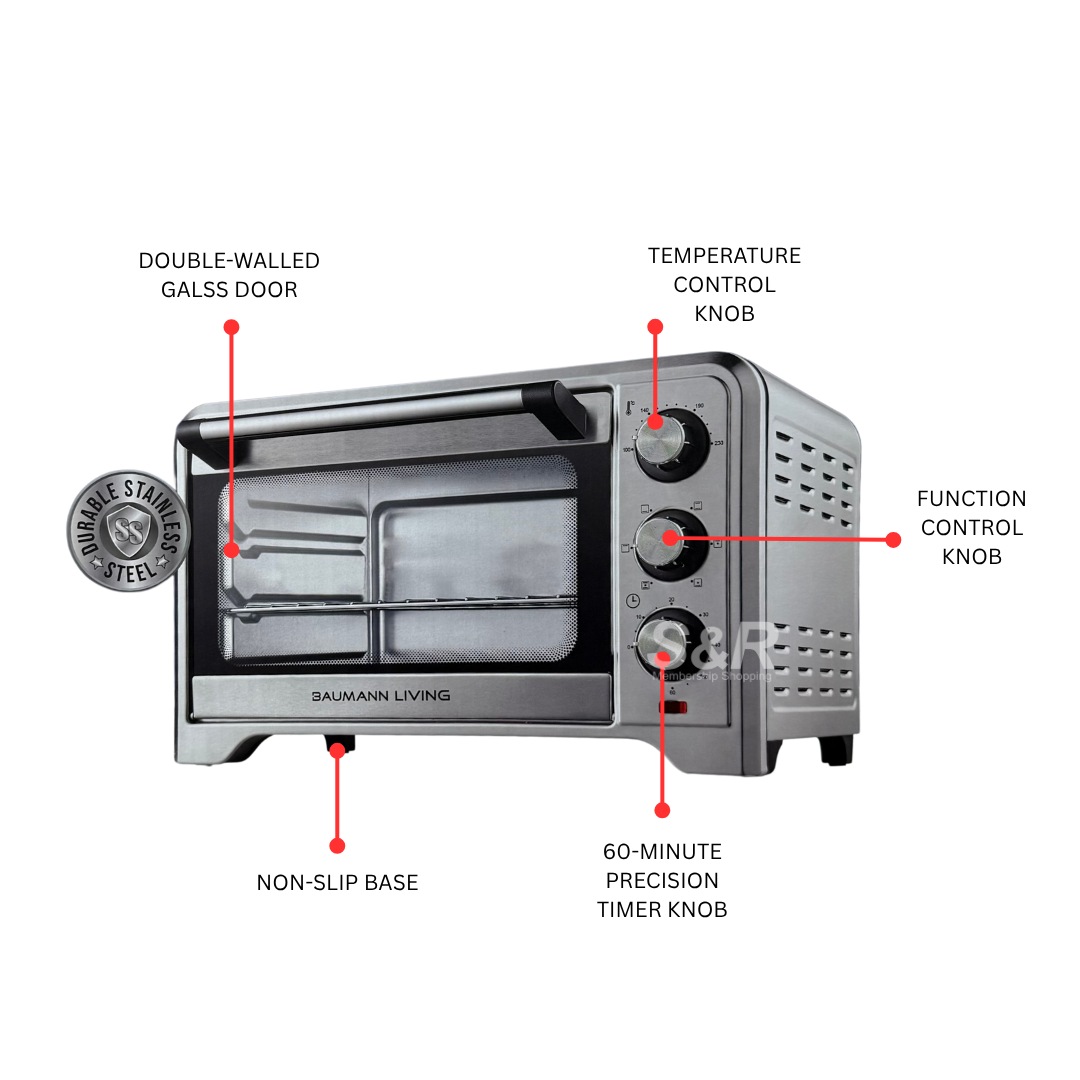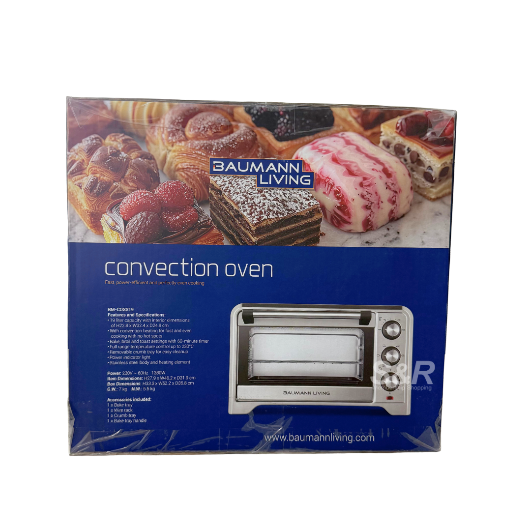 The Baumann Living 19L Convection Oven offers evenly baked results thanks to its hot-air circulation and pre-programmed temperature presets. Use it for baking bread, roasting meat, and more. The digital touch panel simplifies operation and temperature selection. Safety features include auto shut-off and overheating protection. An interior light and glass door allow easy monitoring. Compact yet versatile, it’s perfect for apartments or small kitchens. Comes complete with a baking tray and wire rack ready for use. Enjoy enhanced cooking flexibility and consistent baking results.