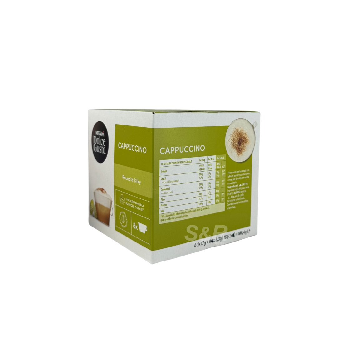 Nescafe Dolce Gusto Cappuccino Pods bring the café experience to your home with a perfect balance of strong espresso and creamy milk froth. Each serving delivers the indulgence of a coffee shop favorite, crafted in minutes with your Dolce Gusto machine. Whether for breakfast or an afternoon treat, this cappuccino will satisfy your craving for smooth and flavorful coffee.