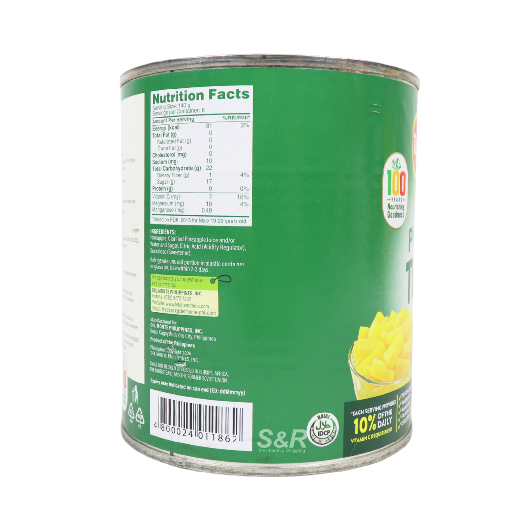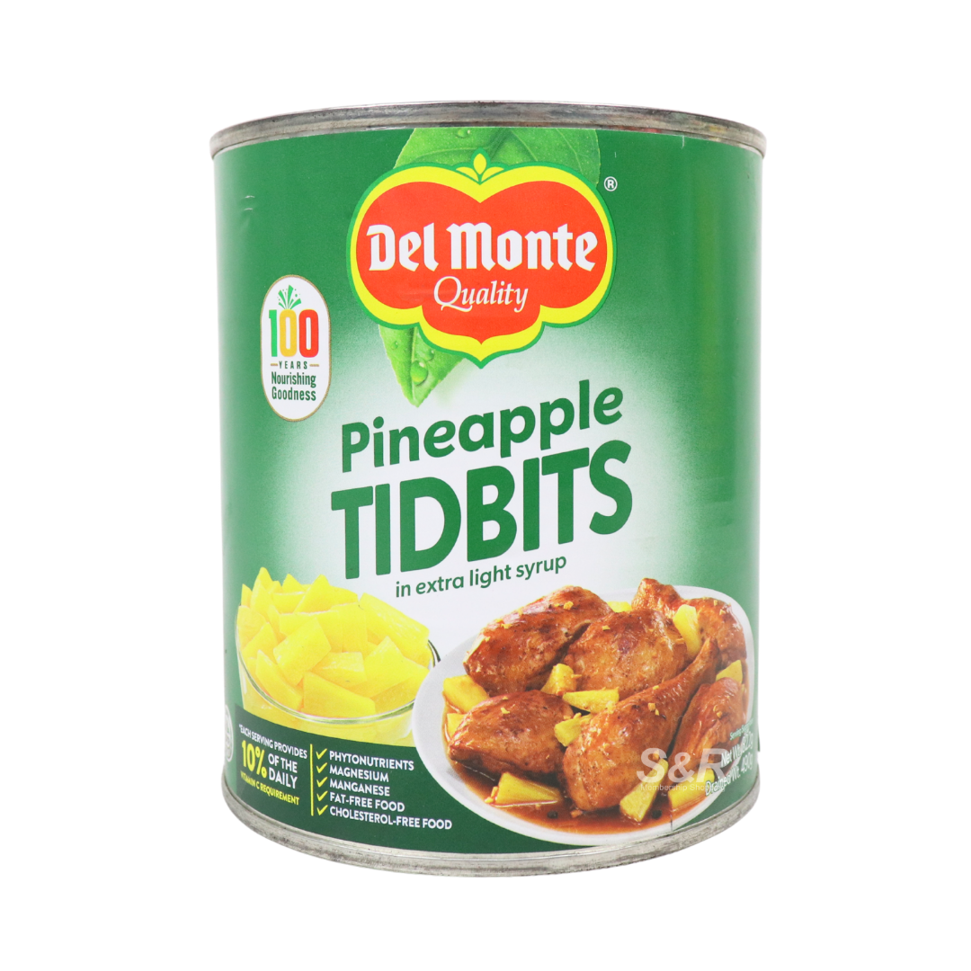 Del Monte Pineapple Tidbits in Extra Light Syrup offer sweet and juicy bite-size pineapple pieces that are perfect for a variety of recipes. Carefully selected pineapples are cut into small tidbits and packed in extra light syrup to preserve their fresh tropical flavor. The convenient size makes them ideal for fruit salads, desserts, baked goods, smoothies, or as a topping for yogurt and cereal. With their naturally sweet taste and vibrant color, these pineapple tidbits add a refreshing touch to both sweet and savory dishes. Enjoy the reliable quality and delicious taste of Del Monte canned fruit products.