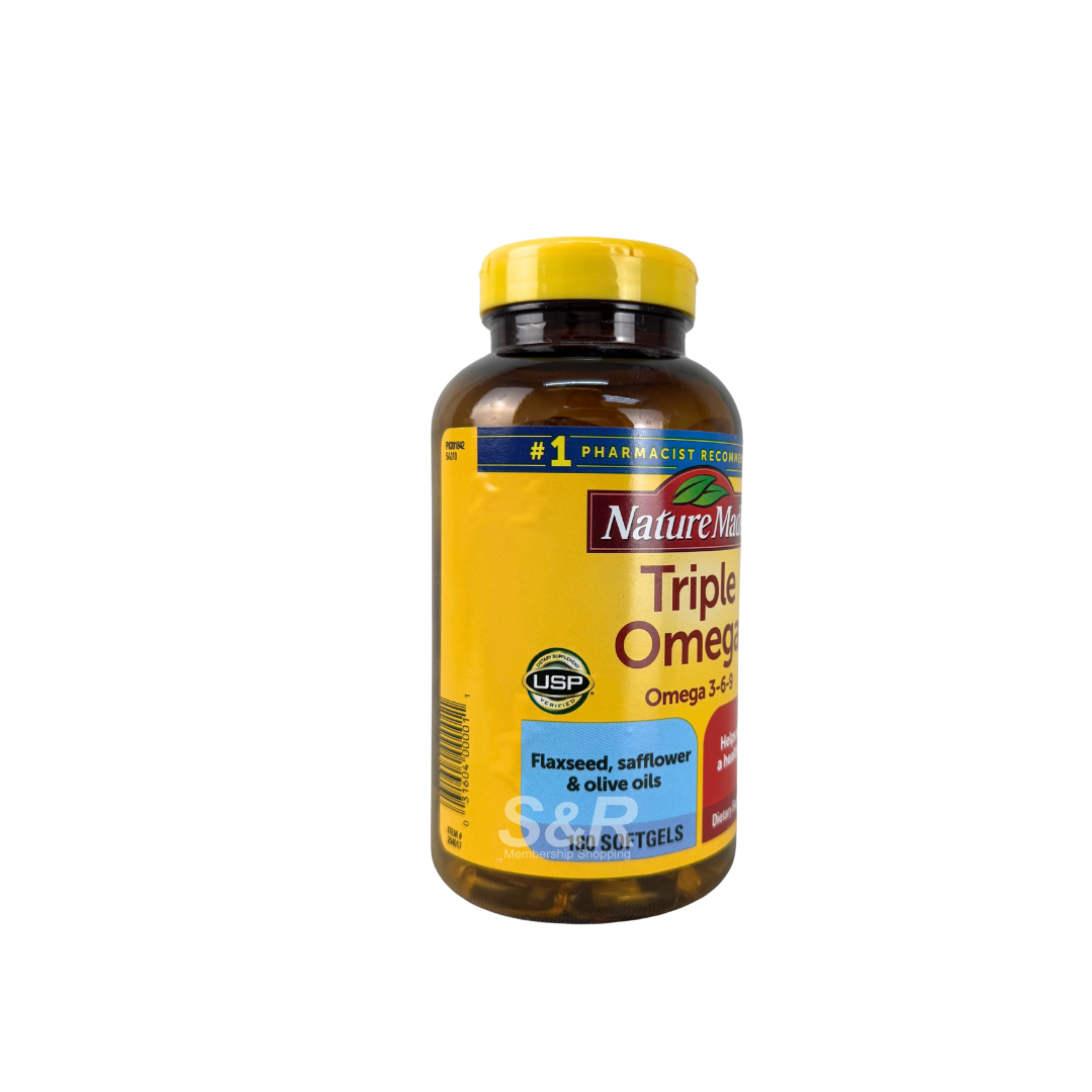 Nature Made Triple Omega provides a blend of Omega-3, -6, and -9 fatty acids to promote heart, brain, and eye health. Derived from purified fish oil and other natural sources, these softgels are formulated without artificial colors or flavors. Ideal for daily supplementation to maintain a healthy lifestyle.