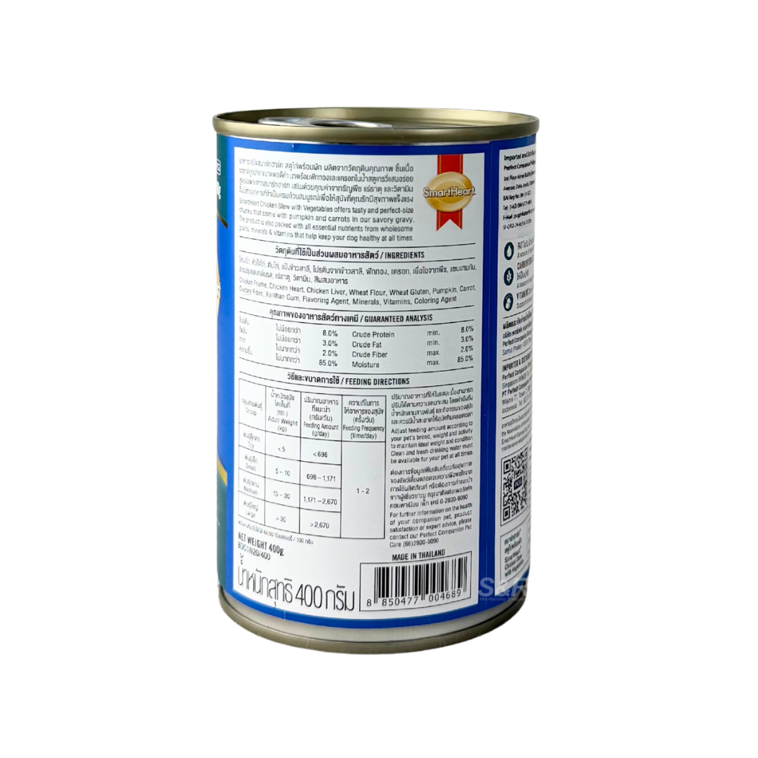 SmartHeart Chicken Stew with Vegetables provides your furry friend with a hearty, nutritious meal in every can. Made from real chicken chunks and wholesome vegetables, it delivers a balanced mix of proteins, vitamins, and minerals. The stew-like texture makes it appealing even for picky eaters while supporting healthy skin, coat, and energy levels.