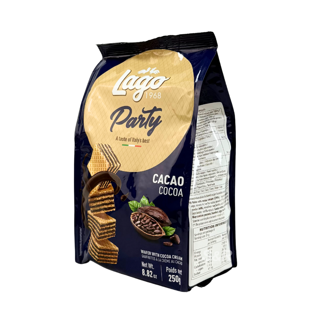 Lago Party Wafer with Cocoa Cream features thin, crispy wafer layers filled with rich cocoa cream. The light texture and smooth filling create a pleasant contrast, making it easy to enjoy as a snack or dessert accompaniment. Perfect for serving at gatherings, coffee breaks, or casual snacking, this wafer offers a refined sweetness that pairs well with hot beverages. Its shareable size makes it suitable for family or group enjoyment.