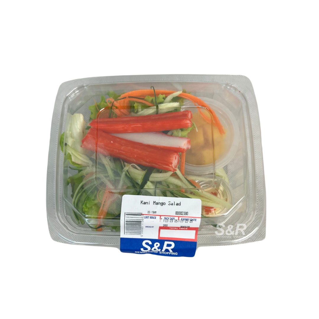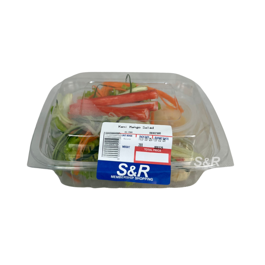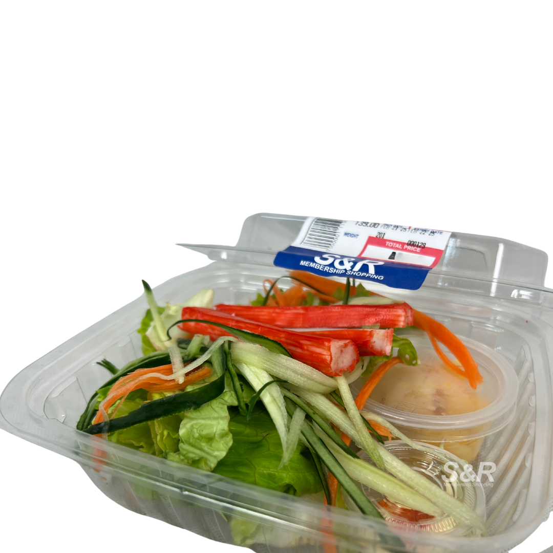 Features a single portion of a delectable salad consisting of crab sticks, mangoes, and fresh vegetables, accompanied by a flavorful dressing, providing a refreshing and satisfying salad option.
